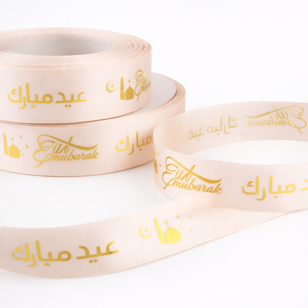 شرائط ستان بلون بيبي روز الفاخر مطبوع باللون الذهبي عبارة عيد مبارك Eid Mubarak باللغتين العربيه والأنجليزيه